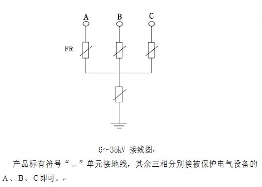 本產品結構采用四星形接法,過電壓保護器A、B、C、D分別采高壓電纜引線,大大縮小了相間距離。由于采用對稱結構,其中任意三個可分別接A、B、C三相,另一相接地。